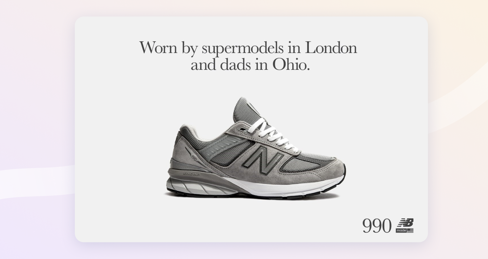 Take this New Balance ad as an example. The line, “Worn by supermodels in London and dads in Ohio,” is perfect. It’s simple, memorable, and paired with a clean image of the product, the shoe. The design is no-nonsense. It highlights the product and the clever copy without overwhelming you.