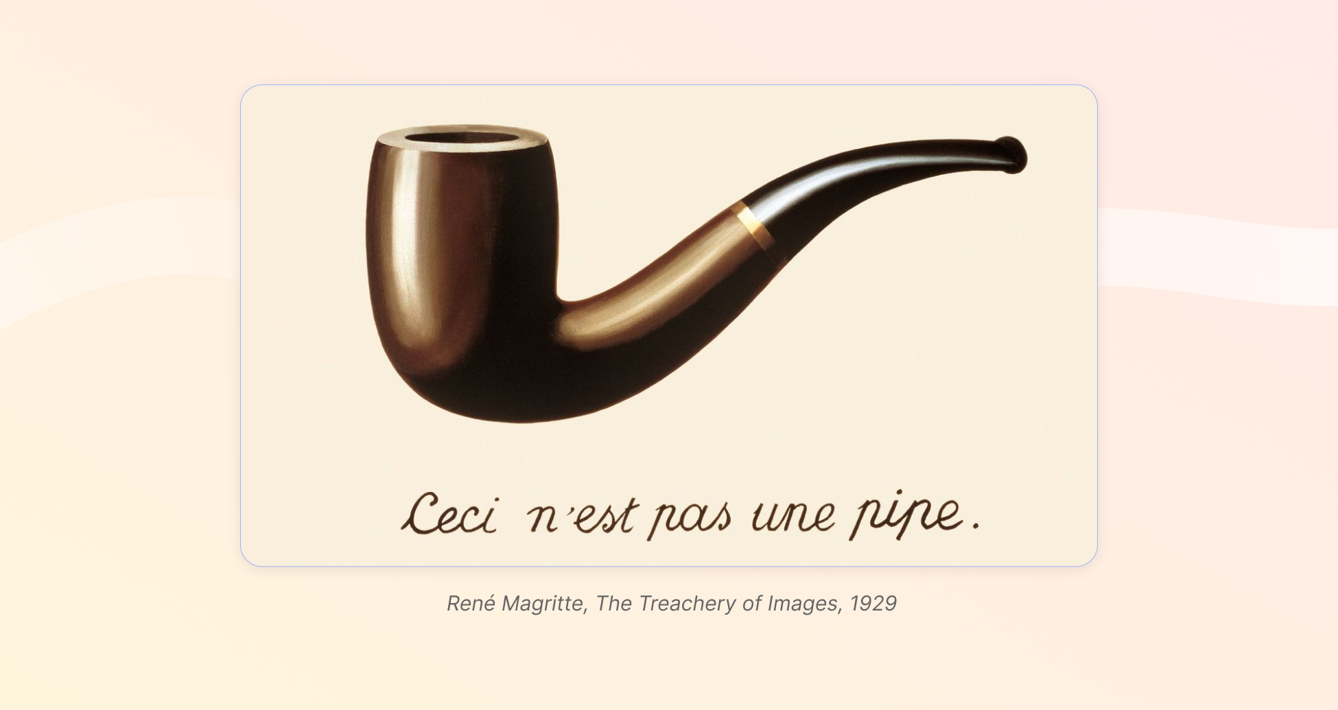 The surrealist painter Magritte famously explored the gap between what we see and how we describe it, especially in his piece The Treachery of Images. It’s the one with the painting of a pipe that says, “This is not a pipe.” Magritte was pointing out that while we can describe something in words, it’s never quite the same as seeing it for ourselves. And that's key here.