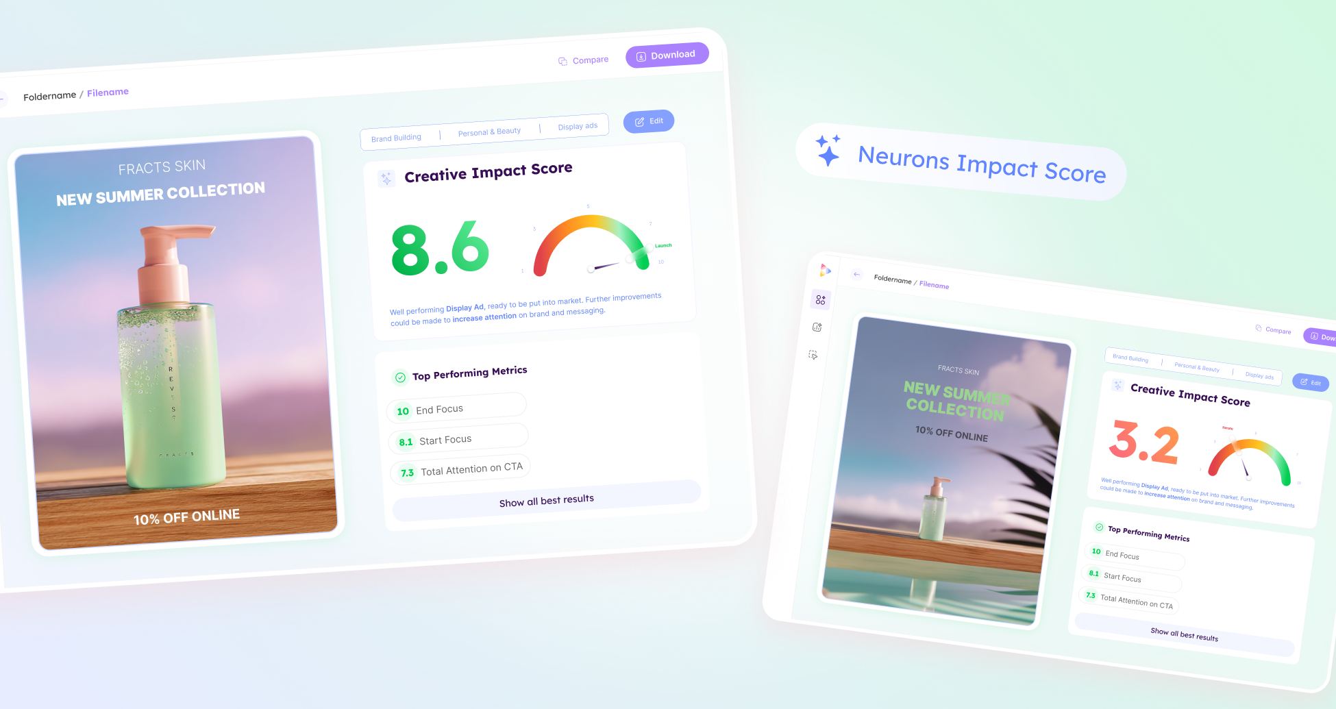 - Neurons Impact Score (NIS): A single 1–10 score that shows how effective your creative is, so you can decide whether to launch, optimize, or redesign.