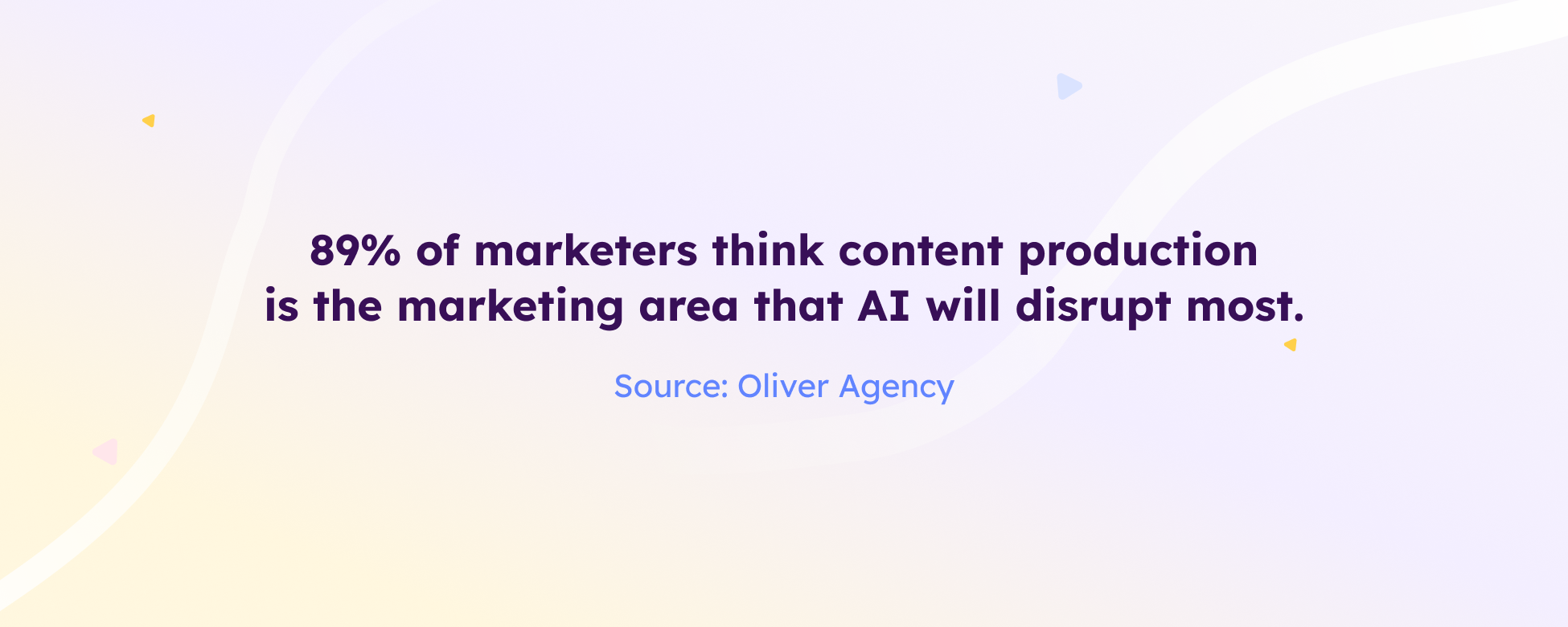When asked about the areas of their marketing operations most likely to be disrupted by AI, 89% pointed to content production. 47% considered social management AI’s main success factor.