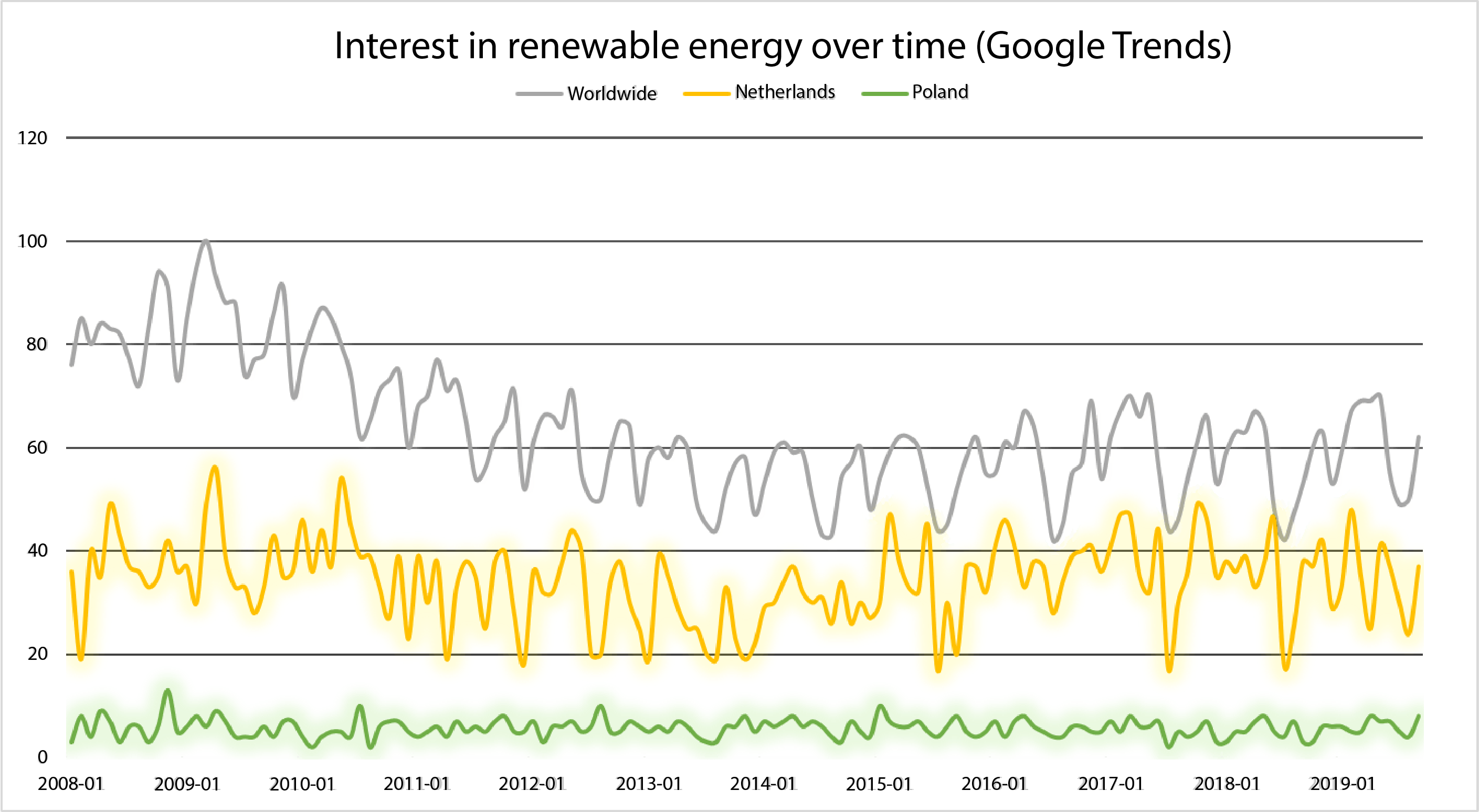 Consumer interest in renewable energy could be seen as in a global decline between 2009 and 2014, but seems to slowly rise again until present day. Interestingly, markets such as the Netherlands and Poland differ dramatically in their interest. While Dutch consumers tend to follow the global annual trends in interest for renewable energy, Polish consumers seem generally less interested.