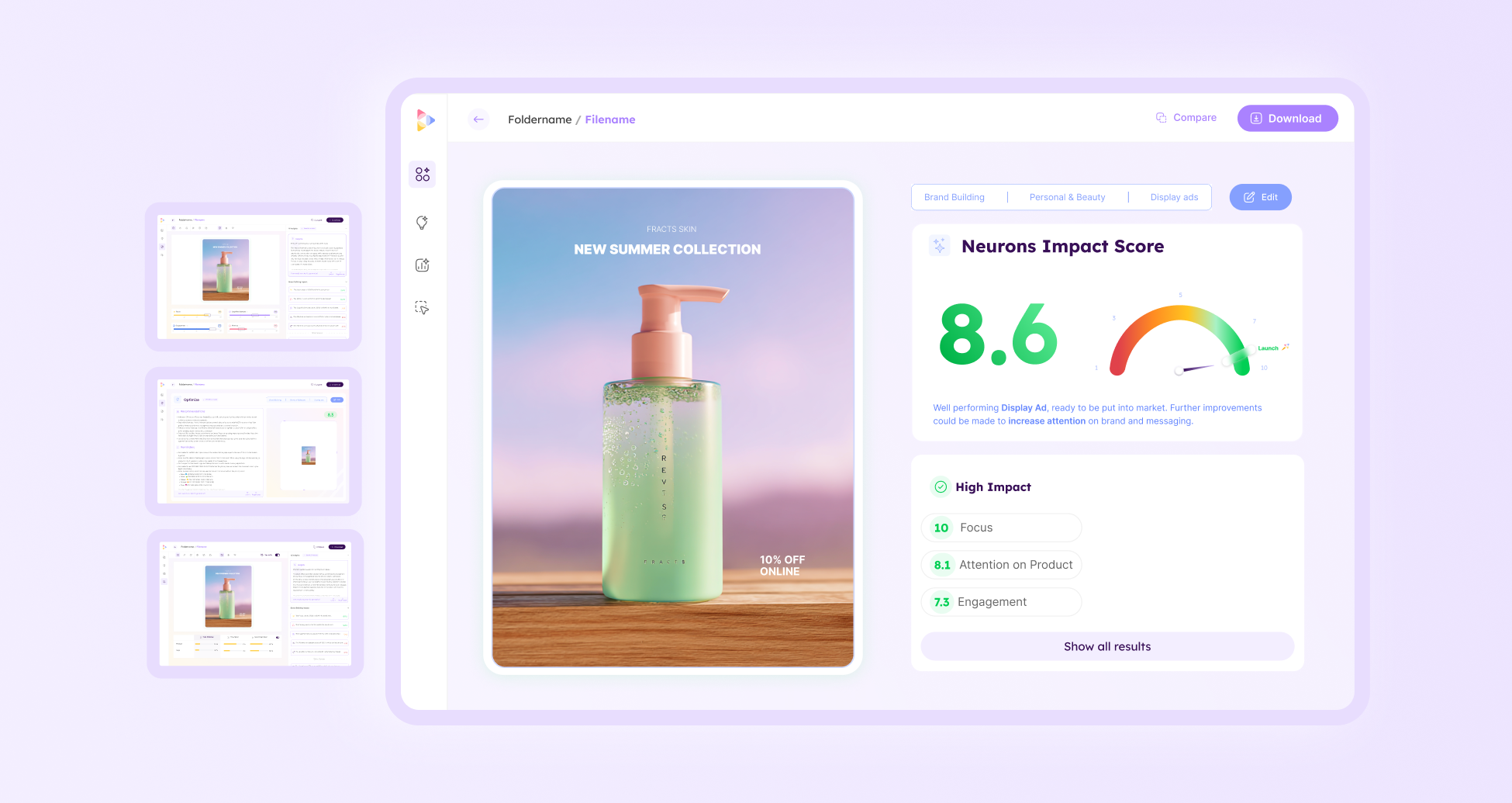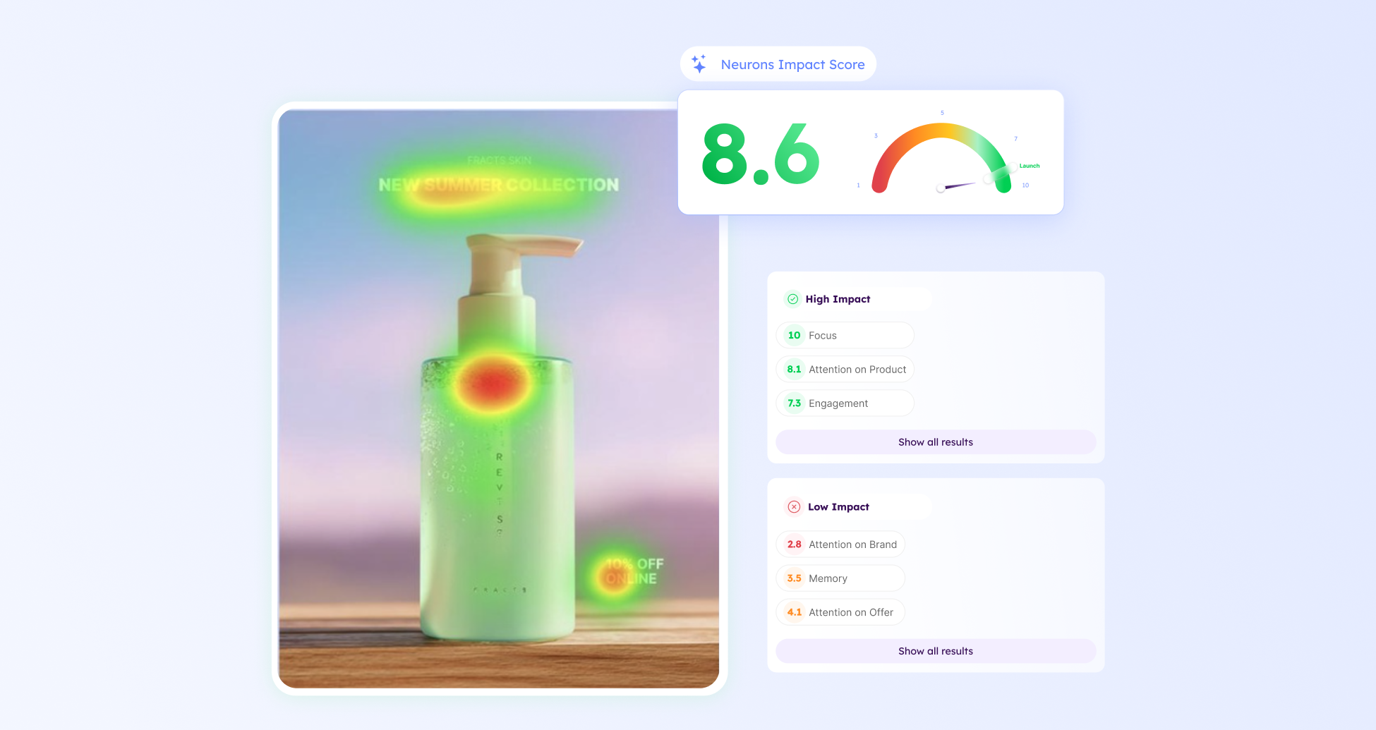 - Neurons Impact Score (NIS): A single 1–10 score that shows how effective your creative is, so you can decide whether to launch, optimize, or redesign.